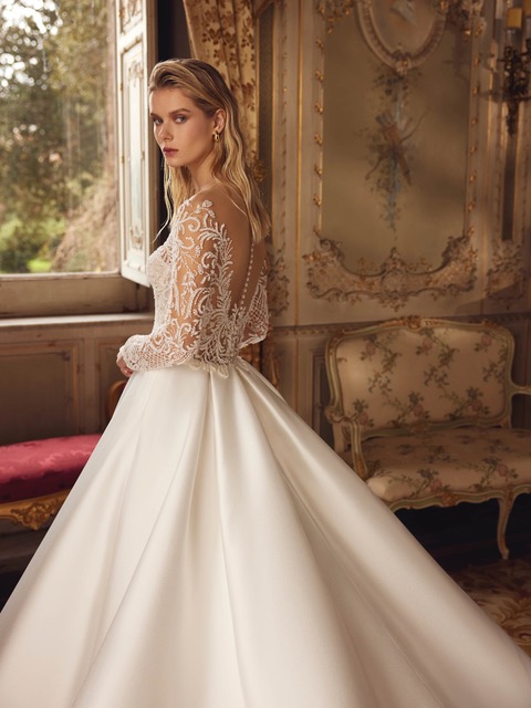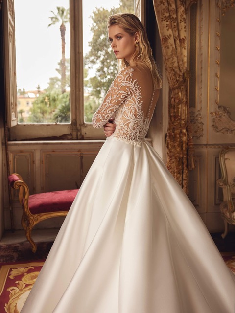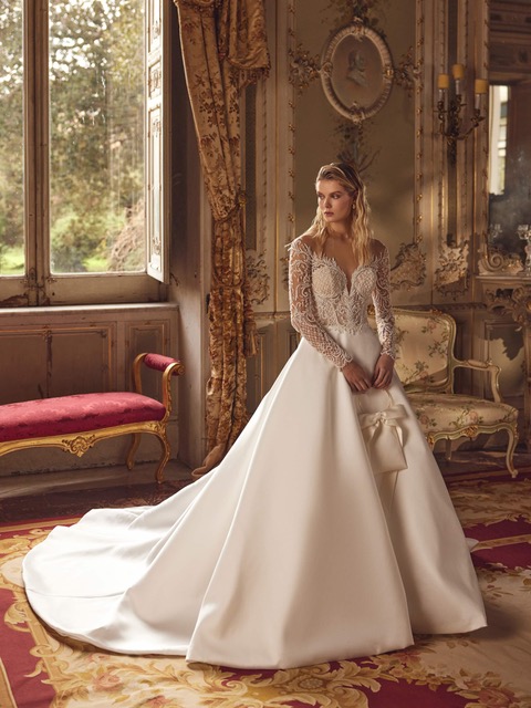 Запази часТази сватбена рокля е създадена за булки,които искат да изпреварят модата.Визията и излъчва стил и блясък.Материята е Микадо,докато силуета е А-линия.Корсета е с изящни дълги ръкави,украсени с мъниста и дантелени мотиви.Роклята има елегантно деколте,което сексапилно разкрива раменете и гърба.