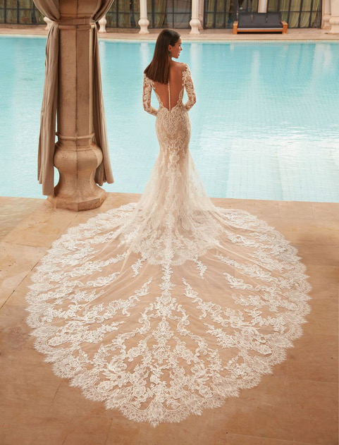 Запази часБулчинска рокля в силует русалка, наистина спираща дъха.Изключително женствена линия, богато украсена дантела и елегантен дълъг ръкав. Невероятен катдрален шлейф, който остава отпечатък на всяка сватбена снимка.