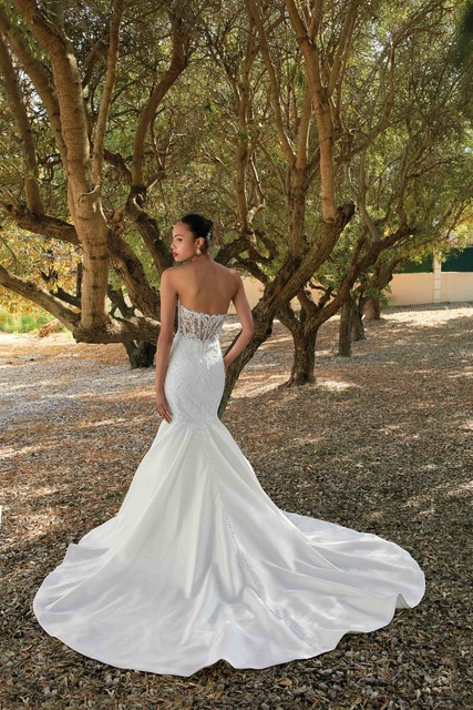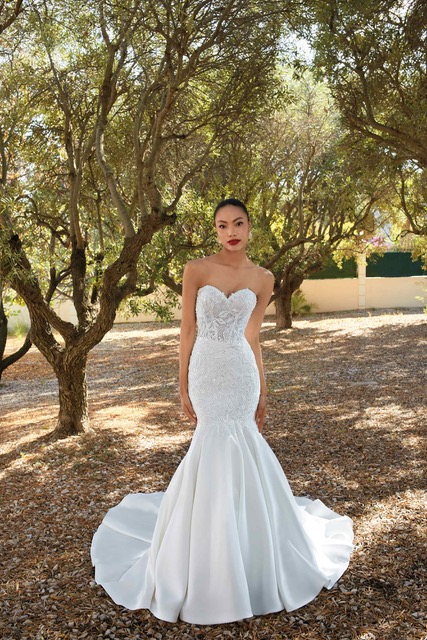 Запази часКомбинация от сатен и луксозна бродирана дантела, въплатени в секси силует. Пищна пола и съблазнителни прозрачни акценти завършват модел 200159 сватбена рокля на Demetrios.