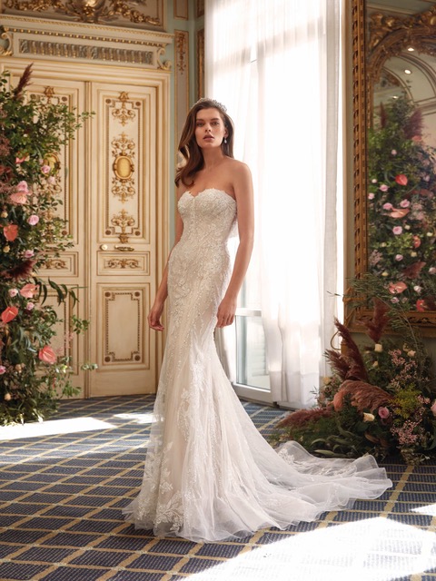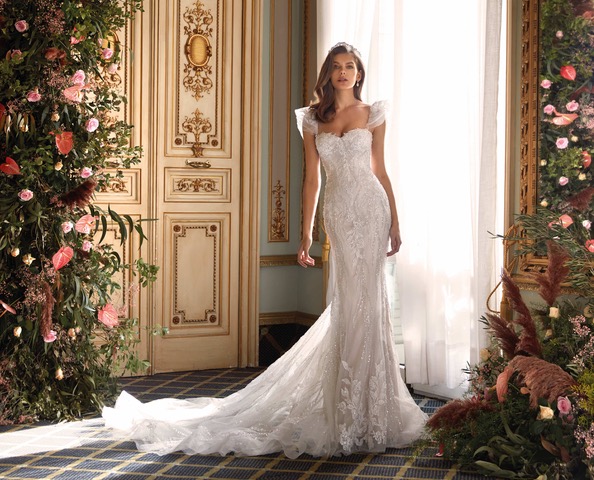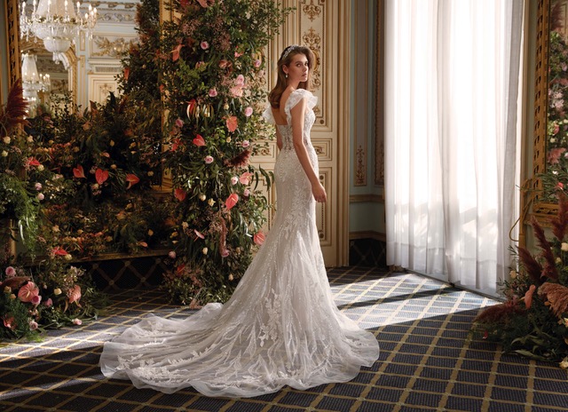 Прекрасна и завладяваща булчинска рокля, невъзможно е да не се влюбиш. Комбинация от дантела и бродерия от камъни и мъниста, в силует русалка, винаги са подходящ избор, за спиращи дъха моменти.
