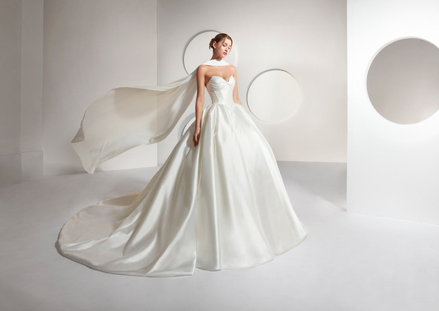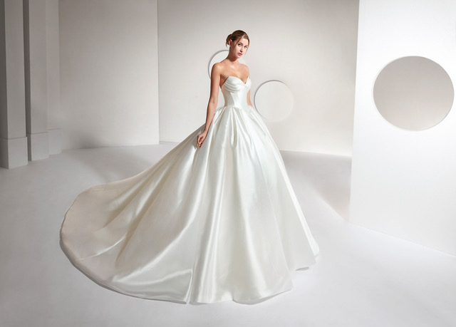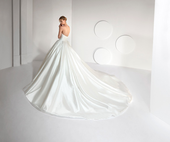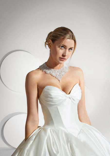 Запази часМинимализмът и максимализмът се смесват безупречно в този шедьовър изработен от тафта. Отличаваща се с плисирани чашки,вталена талия и обемна пола,тази булчинска рокля е олицетворение на съвършенството. Колекцията Alta Moda е създадена за булки със силно чувство към дизайна, които дръзват да взимат смели решения.